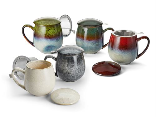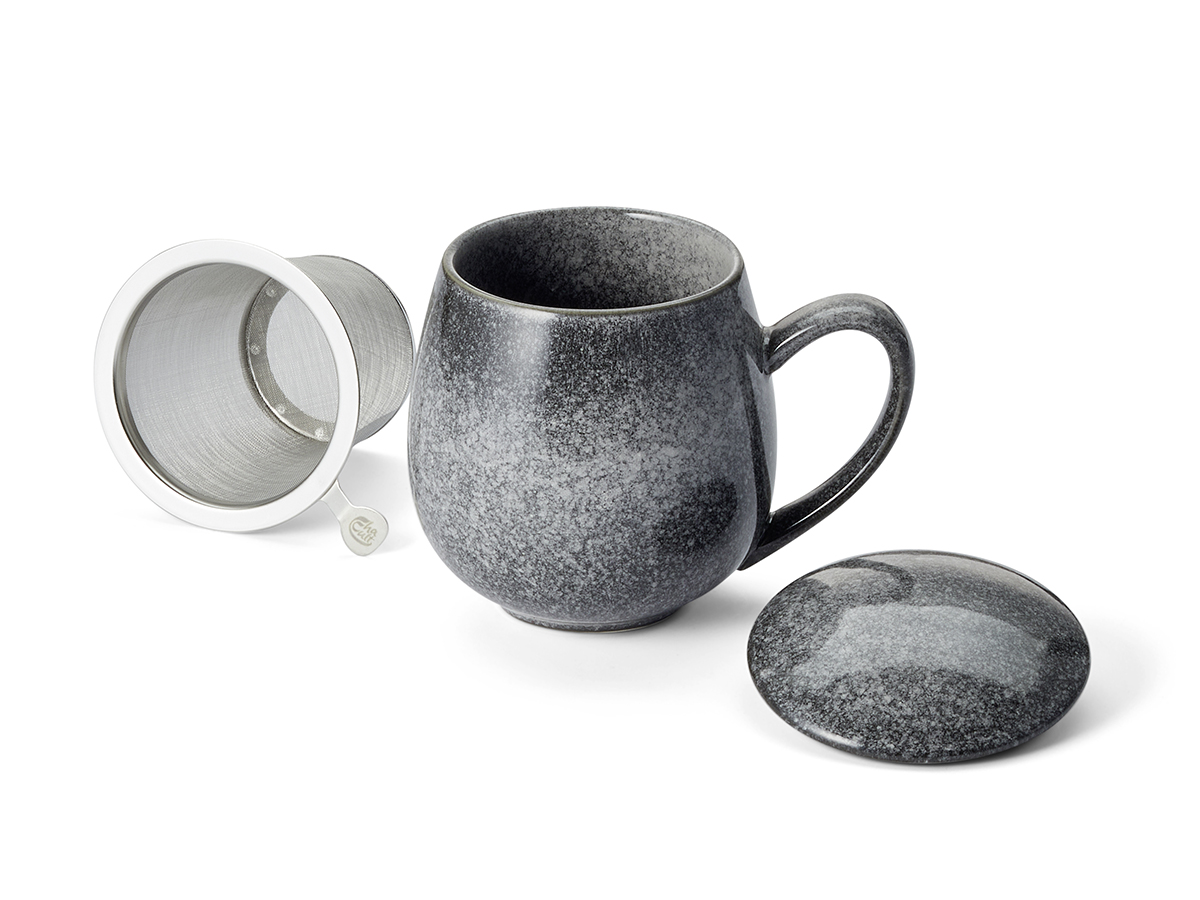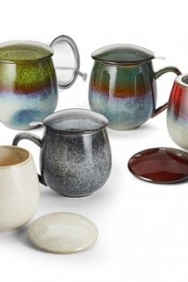 Keramický hrnček s nerezovým sitkom a vrchnákom. Elegantná kameninová úprava s glazúrou.
